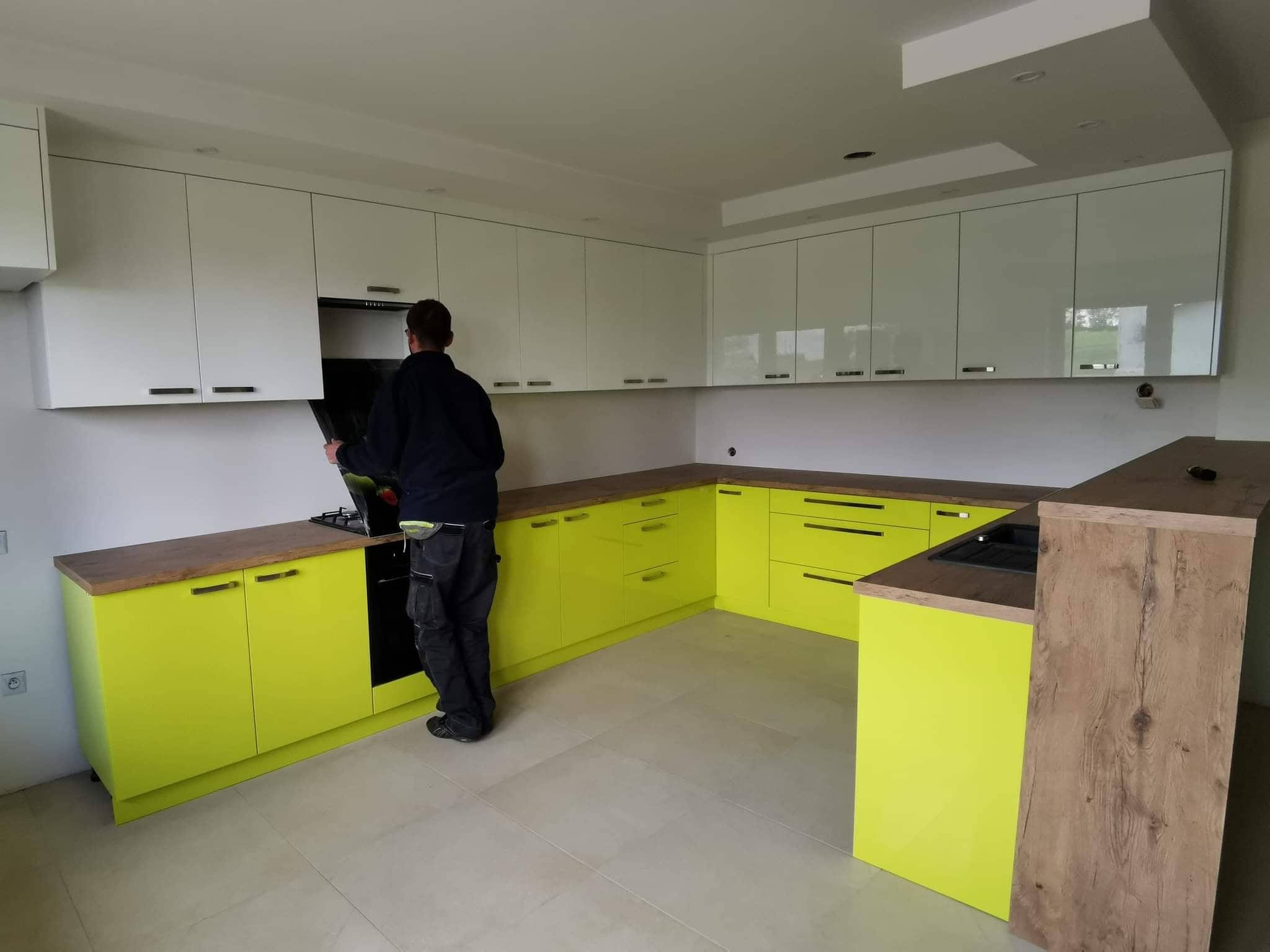 Ostatnia kuchnia to nowoczesne wnętrze, które nie boi się koloru. Białe, górne szafki nadają przestrzeni lekkości i świeżości, a neonowo-żółte fronty dolnych szafek wprowadzają do wnętrza energię i wyjątkowy charakter. Całość została uzupełniona ciepłym blatem drewnopodobnym, który łagodzi kontrasty i dodaje kuchni przytulności. Duża przestrzeń robocza, ergonomiczny układ mebli oraz jasne tło sprawiają, że kuchnia jest nie tylko stylowa, ale też bardzo funkcjonalna. To wnętrze stworzone z myślą o nowoczesnych domach, w których kuchnia jest sercem otwartej przestrzeni.