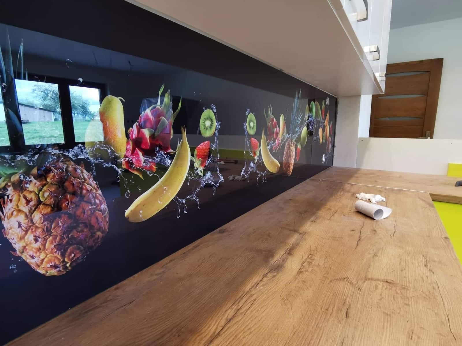 To zdjęcie prezentuje niecodzienny, ale niezwykle efektowny akcent – szklany panel z nadrukiem owoców zanurzonych w wodzie, który stanowi tło dla przestrzeni roboczej w kuchni. Taki detal nie tylko chroni ścianę przed zabrudzeniami, ale również pełni funkcję dekoracyjną, nadając wnętrzu energii i świeżości. Drewniany blat w naturalnym odcieniu równoważy intensywność kolorów panelu i wnosi do wnętrza ciepło. Połączenie nowoczesnych, błyszczących szafek z rustykalnym blatem i artystycznym nadrukiem to ciekawa mieszanka stylów – idealna dla osób szukających oryginalnych, spersonalizowanych rozwiązań.