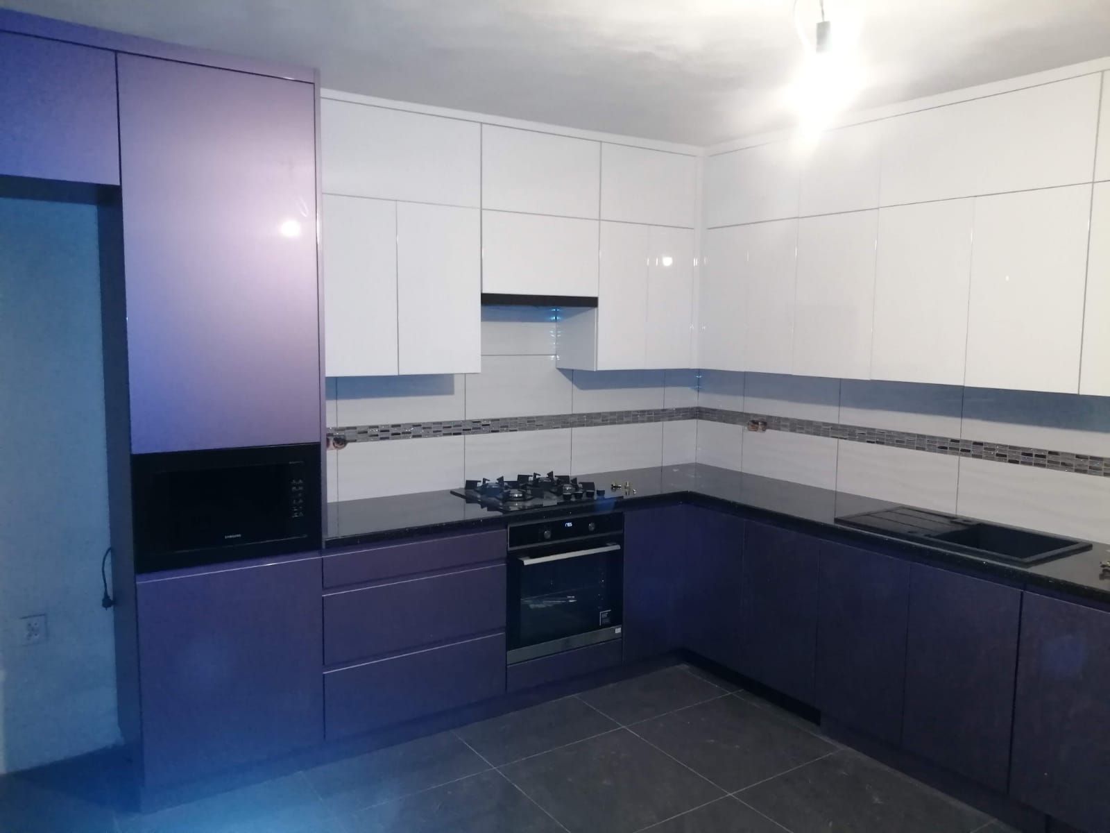 Ta kuchnia to doskonały przykład eleganckiego minimalizmu w nowoczesnym wydaniu. Gładkie, połyskliwe fronty w kolorze białym i głębokim fiolecie tworzą efektowny kontrast, który przyciąga wzrok, a jednocześnie nie przytłacza wnętrza. Zabudowa sięga aż po sufit, maksymalnie wykorzystując dostępną przestrzeń i podkreślając funkcjonalność kuchni. Subtelny pas dekoracyjny nad blatem dodaje charakteru, a układ mebli w kształcie litery „L” zapewnia ergonomię pracy. Całość idealnie sprawdzi się w nowoczesnym mieszkaniu lub domu, gdzie liczy się zarówno estetyka, jak i wygoda codziennego użytkowania.